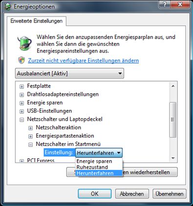 - Netzschalter im Startmenü